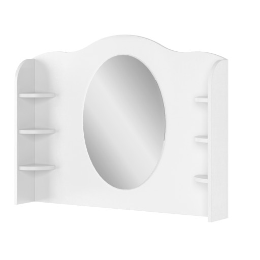 Nadstawka - toaletka do skompletowania z biurkiem (SO-03) lub komodą (SO-05) idealna do pokoju każdej elegantki. Wyposażona w duże lustro w kształcie owalu oraz małe półeczki na kosmetyki, dekoracje lub inne akcesoria. Mebel wykonano z wytrzymałej płyty laminowanej wykończonej trwałym obrzeżem ABS. Uchwyty z tworzywa.
