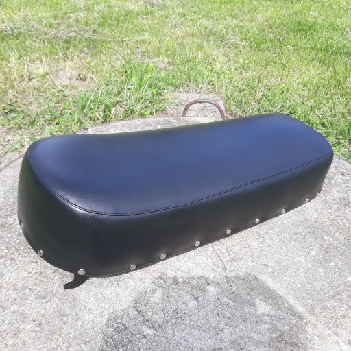 Kompletne nowe siedzenie starszego typy (blacha z dziurą na błotnik) do motocykla WSK 125, 175 GARBUSKA. Siedzenie wykonane ze skaju w kolorze całe czarne. Siedzenie jest zmontowane na gąbce wycinanej dobrej jakości. Siedzenie z gąbką odlewaną dostępne na innej aukcji. Siedzenie ma założone gumowe odboje których nie ma na fotkach. Na innych aukcjach całe siodła i pokrowce w innych kolorach.