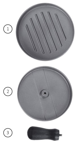 - Praska - pokrywka o wysokości 1.5 cm i średnicy 11.5 cm wykonana z aluminium pokryta powłoką nieprzywierającą. Posiada otwór do samodzielnego wkręcenia rączki ( bez użycia narzędzi)
