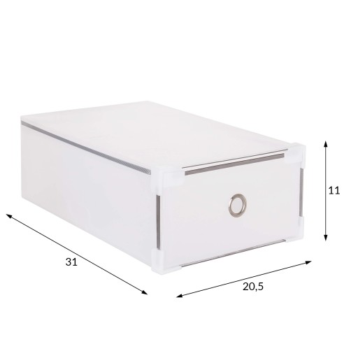 Pojemnik na obuwie został wyposażony w wysuwaną szufladę, które pozwoli na szybki dostęp do wybranych butów. Dodatkowo pudełko posiada specjalne zaczepy pozwalające na łączenie ze sobą pudełek umożliwiając tym samym ułożenie je na sobie. Używając organizera z zamknięciem buty zostaną ochronione przed kurzem oraz wilgocią.