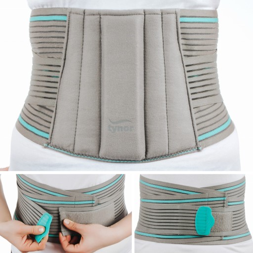 Pas wyposażony jest w system podwójnego naciągu umożliwiający dużą regulację siły kompresji. Rozciągliwe taśmy zapinane są na mocny rzep umiejscowiony na brzuchu. Po zapięciu pierwszej, szerokiej taśmy należy dopasować odpowiednio drugą, węższą, która przebiega przez środek pasa, aby dopasować go do anatomicznego kształtu kręgosłupa w tej części. W tylnej części przylegającej do kręgosłupa pas został wzmocniony elastycznymi fiszbinami. Na środku znajduje się jedna szeroka i dodatkowo po każdej stronie dwie węższa. System ten pozwala usztywnić i utrzymać ten odcinek kręgosłupa we właściwej pozycji, co sprzyja rehabilitacji i zmniejsza dolegliwości bólowe pacjenta.