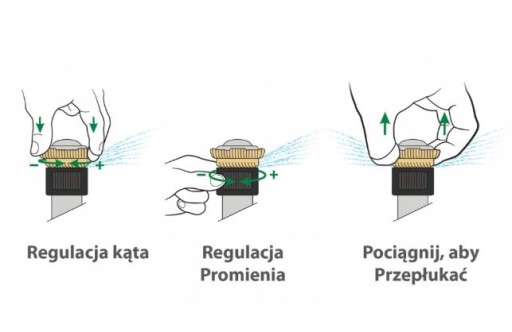 Ręczna regulacja kąta i promienia bez użycia jakichkolwiek narzędzi.