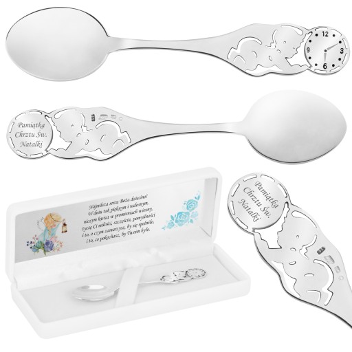 Srebrna łyżeczka z zegarem na Chrzest Dedykacja