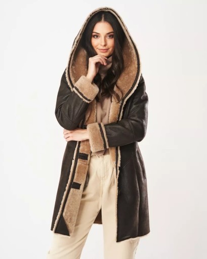 Kożuch damski Megan zapinany jest na praktyczne, eleganckie guziki i posiada przepiękny, obszerny kaptur, tworzący klasyczny, wykładany kołnierz, nadający projektowi niepowtarzalnego charakteru. Całość doskonale dopełniają zdobne wykończenia w formie futrzanych wstawek znajdujące się na mankietach rękawów.