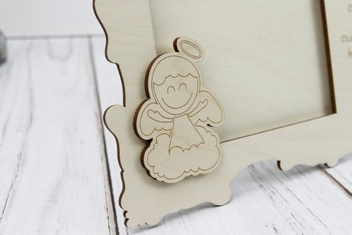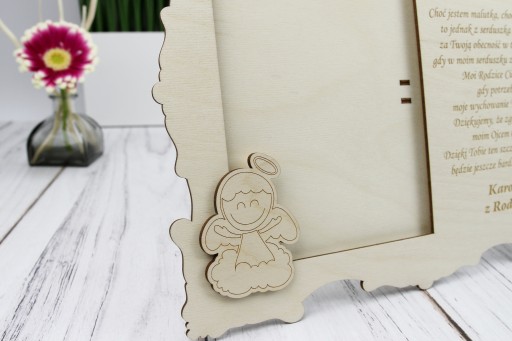 Świetny pomysł na podziękowanie rodzicom Chrzestnym Twojego dziecka i wręczenie pamiątki z Chrztu Świętego w postaci ramki z indywidualnym grawerem. Ramka na zdjęcia wykonana z drewna 3 mm grubości.