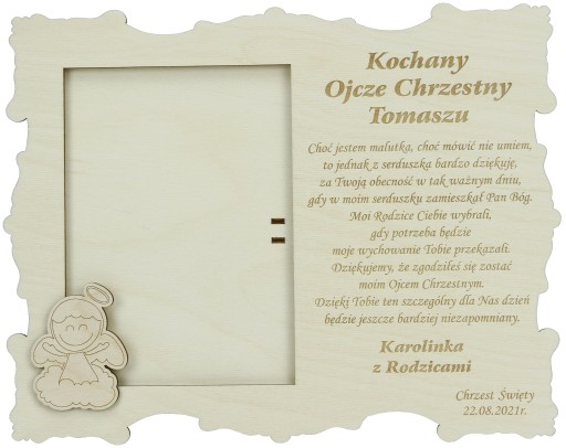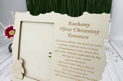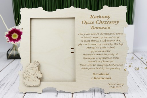 Podziękowanie dla Matki Chrzestnej lub Ojca Chrzestnego z okazji Chrztu Świętego w postaci drewnianej ramki na zdjęcie.