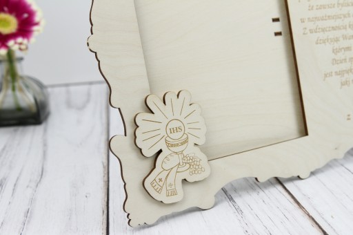 Dodatkową komunijną aplikację z drewna w lewym dolnym rogu można usunąć lub dołączyć inną (np. aniołek, samochodzik, misio, różyczka, serduszka itp.)