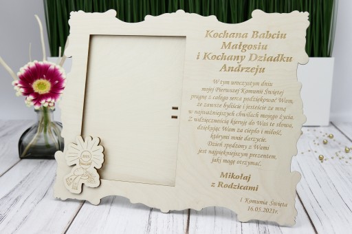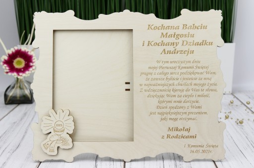 Świetny pomysł na podziękowanie dziadkom, rodzicom Chrzestnym i wręczenie pamiątki z I Komunii Św. w postaci ramki z indywidualnym grawerem. Ramka na zdjęcia wykonana jest z drewna 3 mm grubości.