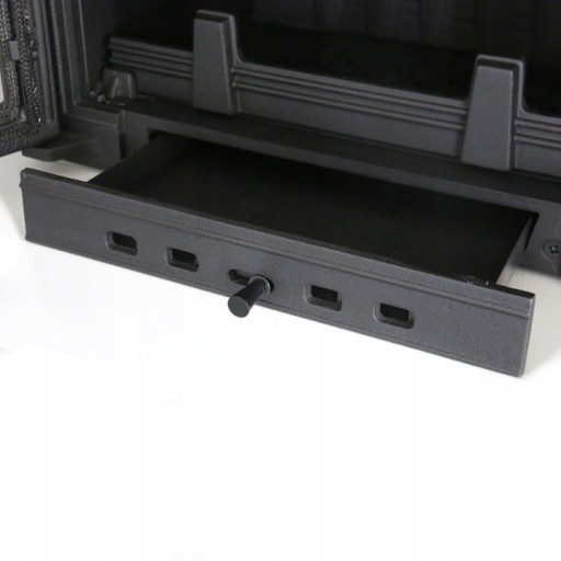 Ułatwia utrzymanie wkładu w czystości. Gałka z przodu szuflady pozwala na regulację dopływu powietrza z pomieszczenia. Dodatkowo płotek, który jest umieszczony we wkładzie zapobiega wypadaniu drewna.