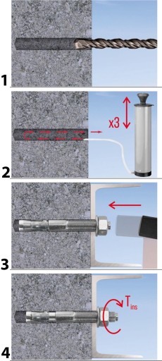 - głębokość otworu wiercenia powinien być co najmniej 10 mm dłuższy od głębokości zakotwienia łącznika- pozwoli to, na prawidłowe osadzenie kotwy mechanicznej w otworze,