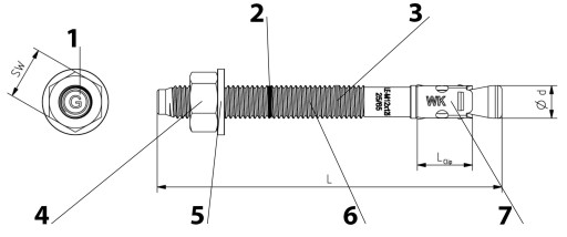 Kotwa mechaniczna LE-ZN składa się z nagwintowanego trzpienia zakończonego stożkiem rozpierającym, opaski rozporowej oraz nakrętki sześciokątnej i podkładki. Wykonana jest ze stali niskowęglowej i pokryta warstwą ocynku, co zapewnia ochronę antykorozyjną. Zamocowanie następuje poprzez dokręcenie nakrętki odpowiednim momentem, co powoduje przesunięcie opaski rozporowej i powstanie trwałego zakotwienia w podłożu.