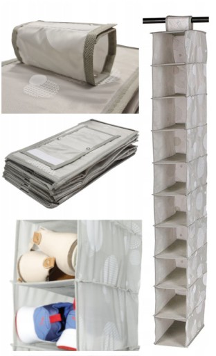 Szary organizer składający się z 10 wiszących półek służących do przechowywania odzieży, czapek szalików bluzek. Pozwoli ci posegregować rzeczy i zapanować nad bałaganem . Znajdzie swoje zastosowanie w szafie ,garderobie czy nawet pokoju dziecka.