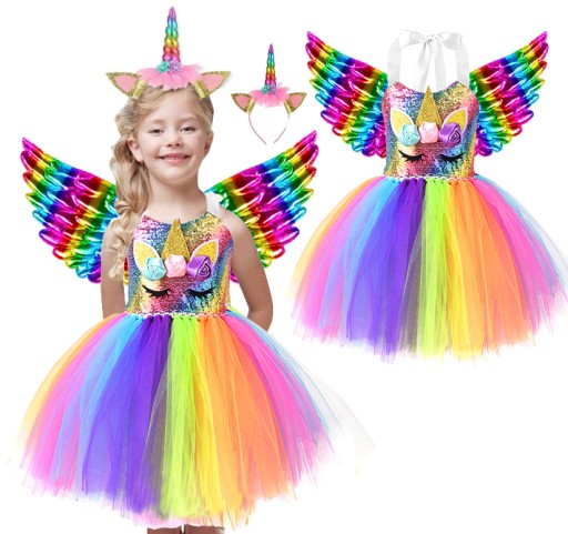 Sukienka tęczowa, składa się z tiulu oraz warstwy cekinów tęczowych dającej połyskujący efekt. Pięknie odbija światło. Dół tęczowy tiulowy TUTU.