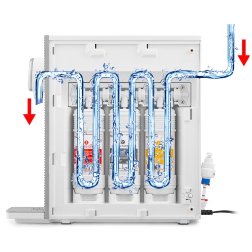 - 5-stopniowy system filtrowania wody: zgrupowany w trzech niezależnych, wymiennych wkładach.