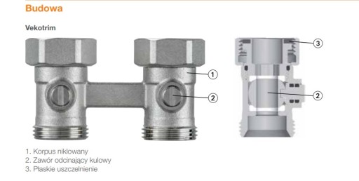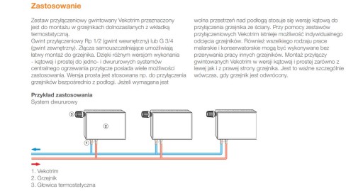 Zestaw przyłączeniowy Vekotrim jest przeznaczony do podłączenia grzejników dolnozasilanych z wkładką termostatyczną z gwintem zewnętrznym G3/4”. Złącza samouszczelniające umożliwiają łatwy montaż do grzejnika. Zestaw ten występuje w wersji prostej i kątowej z funkcją odcięcia bez nastawy wstępnej.