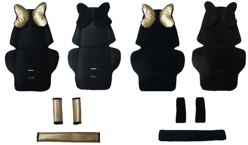Dwustronna wkładka do wózka dziecięcego z poduszeczką "MOTYLEK" wraz z ochraniaczami na pasy i barierkę wykonane są z POLIESTRU w różnych wzorach i kolorach połączonych z miłym w dotyku VELVETEM (MINKI). W wewnątrz wkładka wypełniona jest gąbką o grubości 10 mm i ovatą.