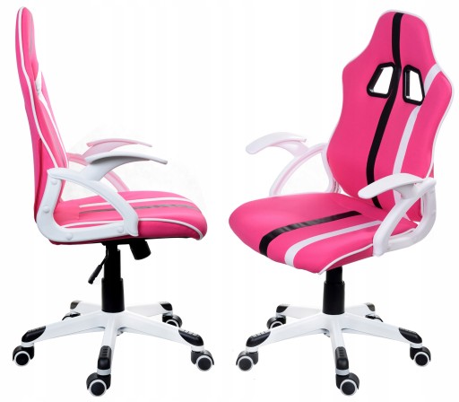 Obrotowy, nowoczesny fotel FBL wykonany z tkaniny w kolorze różowym z dodatkowym efektownym wykończeniem paskami z eko-skóry w kolorze białym i czarnym. Fotel jest wygodny, posiada wspieranie lędźwi. Zaopatrzony został w mechanizm TILT, który umożliwia odchylanie całego fotela oraz możliwość jego blokady dla dodania stabilności.