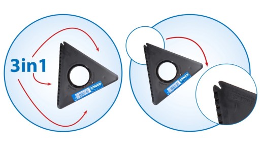 Skrobaczka o unikalnym trójkątnym kształcie ma 3 ostre ostrza, których pozycję z łatwością można zmieniać. Ostrza skrobaczki są wykonane w 100% z poliwęglanu. Zaprojektowane są, aby skutecznie usuwać nawet grube warstwy lodu.