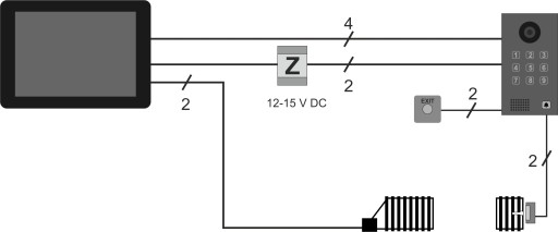 - Połączenie 4 żyły +2 żyły zasilanie zamka i stacji zewnętrznej +2 żyły sterowanie bramą automatyczną.