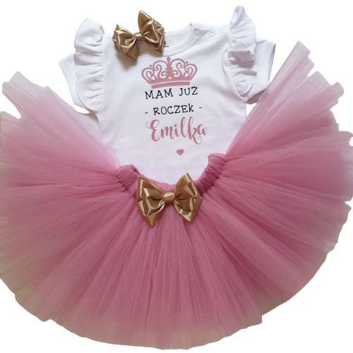 SPÓDNICZKA TUTU z piękną kokardą pasującą do spódniczki + OPASKA do kompletu na bezuciskowej gumce + BODY z urodzinowy napisem