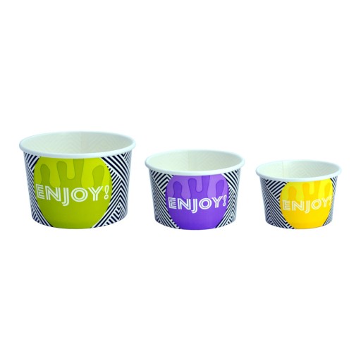 - Papierowy kubeczek do lodów i deserów z białego papieru z kolorowym nadrukiem,