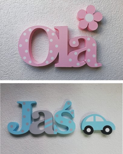 Wysokość największej literki to około 17cm reszta literek proporcjonalnie według wzoru. Literki malowane są ręcznie farbami akrylowymi, zdobione różnymi motywami co daje super efekt końcowy.