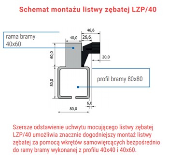 Listwa idealnie nadaje się do bram z profilem 40mm na szynie 80mm, dlatego że zębatka jest o 6mm dalej odsadzona niż standardowa listwa, przez co koło zębate w napędzie nie obciera nam o szynę jezdną.(jak na załączonym zdjęciu)