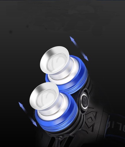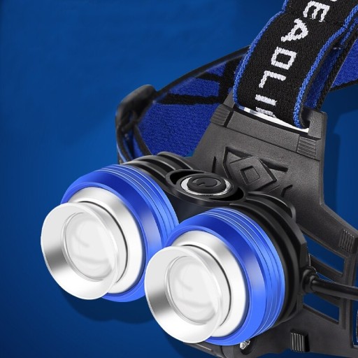 Latarka czołowa posiada 2 odzielne super silne diody XM-L T6 . Każda z osobna posiada ZOOM z płynną regulację. Przełącznik w tym modelu pozwala na sterowanie każdą diodą z osobna, bądź wszystkimi jednocześnie. Latarka posiada 3 tryby pracy 100 % 50 % Strobo. Ładowanie akumulatorów odbywa się poprzez przewód USB dołączony do zestawu. Stopniowana regulacja nachylenia latarki. Latarka posiada również na tylnej obudowie diodę czerwoną sygnalizacyjną świecącą światłem stałym bądź migającym.W zestawie znajdują się akumulatory typu 18650 x 2 sztuki.