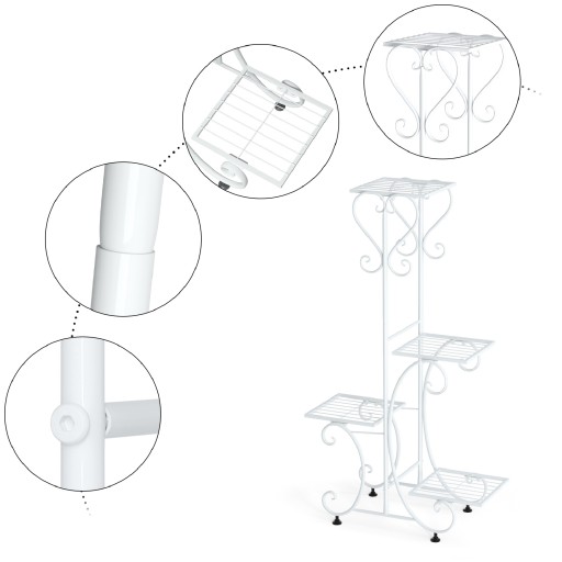 Wykonany z metalowego żelaza z bezszwowym spawaniem, bardzo trwały i wytrzymały, aby uniknąć wypaczenia. Farba galwaniczna chroni metalową ramę przed rdzą. Stojak podnosi rośliny z ziemi, zapewnia im wystarczającą ilość światła słonecznego i lepszy wzrost. Taca z przekładkami zapobiega gromadzeniu się wody podczas podlewania.