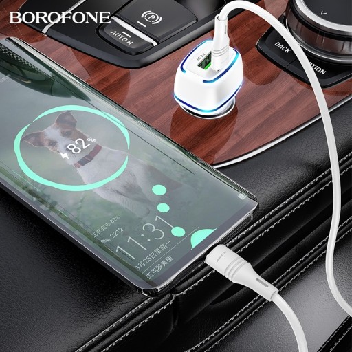 BOROFONE BZ14A Mercury to ładowarka samochodowa z dwoma portami USB, jednym USB typu A w standardzie Quick Charge 3.0 / QC3.0 i drugim USB Type-C w standardzie USB Power Delivery PD20W. Oba gniazda o mocy maksymalnej 3A, sama ładowarka ma moc łączną na dwóch gniazdach również 3A maksymalnie. Ładowarka posiada dodatkowe podświetlenie w technologii LED oraz dedykowany urządzeniom z systemem Android kabel z dwoma złączami USB Type-C.