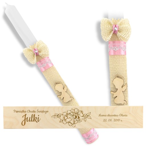 Świeca do chrztu na prezent dla dziecka z okazji Chrztu świętego. Piękna świeca do chrztu zostanie umieszczona w drewnianym pudełku z indywidualnym grawerem. Świeca to kunszt ręcznie robionego dzieła, który zachwyci każdą osobę, a grawer uczyni ze skromnego prezentu pamiątkę na całe lata.