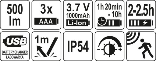 LATARKA CZOŁOWA 500LM, AKU/3XAAA, CZUJNIK RUCHU, LI-ION 3,7V 1000MAH, IP54, PŁYNNA REGULACJA ŚWIATŁA