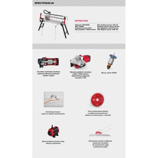- Przecinarka WTPDG1200 wyposażona jest w mocny silnik 2300W. Głowica maszyny przesuwa się i ma możliwość przechylenia o 45º do wykonywania cięć ukośnych. Możliwość złożenia nóg maszyny ułatwia przechowywanie i transport. W zestawie dodatkowy boczny blat stabilizujący ułożenie dużych płytek. Możliwość cięcia na sucho jak i na mokro. Dołączone do zestawu przymiary kątowe i szablony ułatwiają pracę.