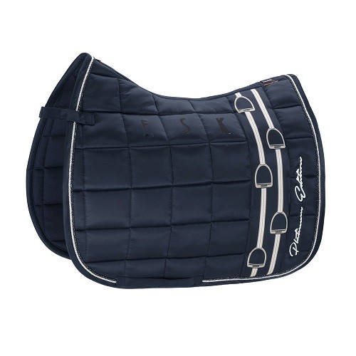 Czaprak Topseller firmy ESKADRON błyszczący. W znanym, obszernym dużym kwadratowym szyciu z podwójnym sznurkiem, błyszczącym brzegiem i pionowymi ozdobnymi paskami z haftem platynowym po obu stronach, ten czaprak jest szlachetnym przyciągającym wzrok kolekcji. Z silikonowymi powierzchniami antypoślizgowymi zapobiegającymi zsuwaniu się siodła. Spód jest wyposażony w oddychającą siatkę Cool-Dry, która gwarantuje optymalne pocenie się i oddychalność.
