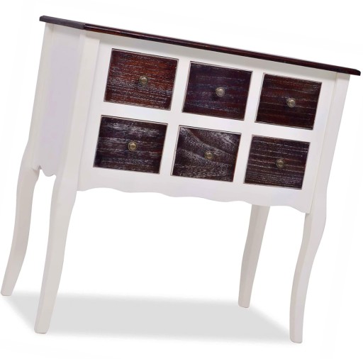 Chcesz urządzić swoje wnętrze, lecz nie posiadasz zbyt dużo wolnego miejsca? Z pewnością w takiej sytuacji sprawdzi się konsola Olviso! Styl vintage oraz połączenie białego koloru z brązowym ożywią Twoją sypialnię, salon, przedpokój czy gabinet. Przestronny blat oraz sześć pojemnych szuflad zapewnią wystarczającą ilość miejsca do przechowywania rozmaitych rzeczy, co z pewnością jest ważną zaletą w niewielkich pomieszczeniach. Każdą szufladę można wyjąć, co ułatwia utrzymanie mebla w czystości. Eleganckie, zakrzywione nogi dodają szyku oraz elegancji. Połączenie naturalnego drewna sosnowego oraz płyty MDF zapewnia zjawiskowy wygląd, odporność na uszkodzenia mechaniczne oraz wieloletnią trwałość. Dzięki eleganckiej prostocie i wszechstronnej funkcjonalności Olviso jest konsolą, która świetnie sprawdzi się w każdym otoczeniu.