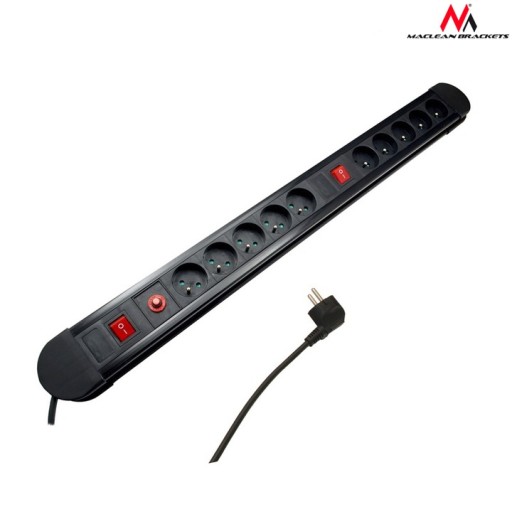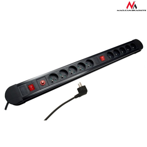 Listwa zasilająca z 10 gniazdkami, 2 włącznikami oraz automatycznym bezpiecznikiem renomowanej firmy Maclean.