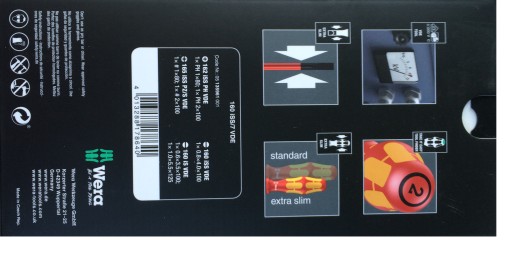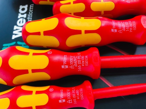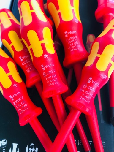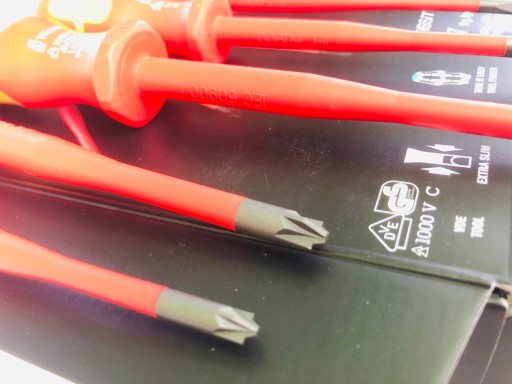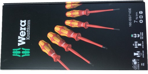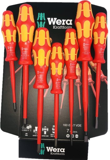 Zestaw 7 wkrętaków Kraftform VDE iSS, ze zredukowaną średnicą trzpienia i rękojeści do prac w wąskich przestrzeniach oraz do zagłębionych połączeń śrubowych i sprężyn; każde narzędzie testowane pojedynczo zgodnie z IEC 60900; kontrola izolacji poprzez zanurzenie w kąpieli wodnej pod napięciem 10000 V gwarantuje bezpieczeństwo pracy pod napięciem 1000 V.