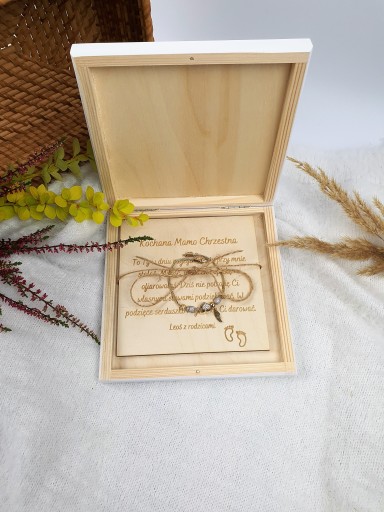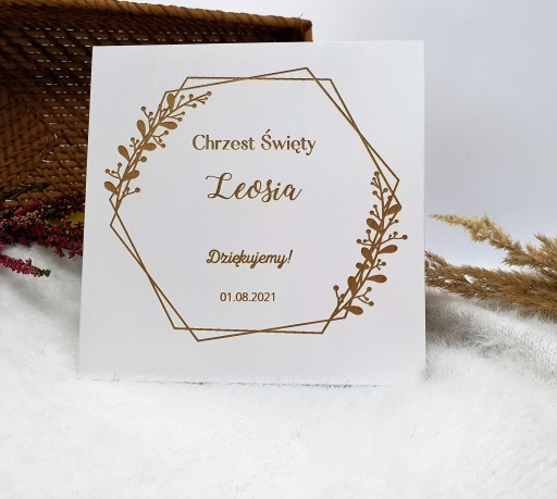 Personalizowane podziękowania dla chrzestnych w drewnianym białym Pudełku Na Chrzest Święty.