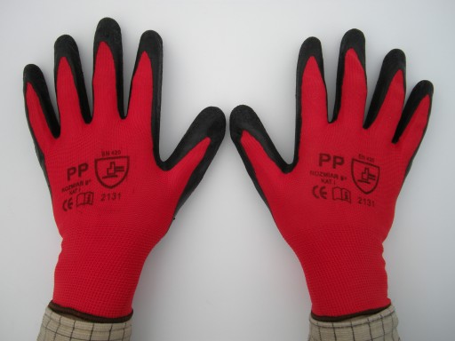 - rękawice ochronne wykonane z poliestru, powleczone lateksem o chropowatej strukturze, która zapewnia doskonałą chwytność, nie powodując usztywnienia rękawicy