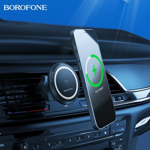 BOROFONE BH45 Mobile to zwiększający bezpieczeństwo jazdy, magnetyczny uchwyt MagSafe na telefon z ładowaniem bezprzewodowym / indukcyjnym o mocy maksymalnej 15W, wyposażony w mocowanie na kratkę wentylacyjną za pomocą silikonowych ramion z dociskiem, wykończony strukturą o wzorze włókna węglowego.