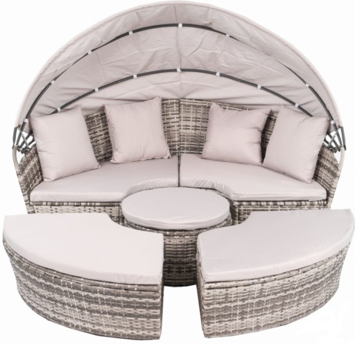Termin polirattan to połączenie polietylenu i rattanu. Lekki splot składa się z bardzo wytrzymałego włókna syntetycznego i dzięki swoim pozytywnym właściwościom od lat cieszy się dużą popularnością. W przeciwieństwie do konwencjonalnego rattanu, polirattan nie rozpryskuje się, jest odporny na promieniowanie UV, a także niezwykle wytrzymały. W zestawie znajduję się także pokrowiec , który zabezpieczy naszą wyspę przed niekorzystnymi warunkami atmosferycznymi.