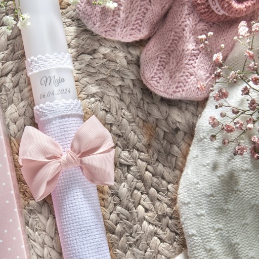 Elegancka biała świeca jest ozdobiona wyjątkowymi elementami: bawełnianą koronką oraz ręcznie robioną kokardką. Na świecy znajduje się personalizacja: imię dziecka oraz data uroczystości.