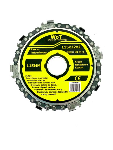 Solidna i trwała stalowa tarcza tnąca do drewna w rozmiarze 115 mm z naciągniętym na obwodzie łańcuchem tnącym.