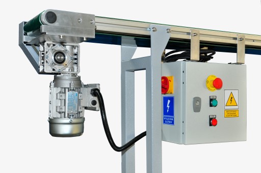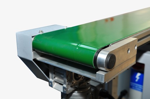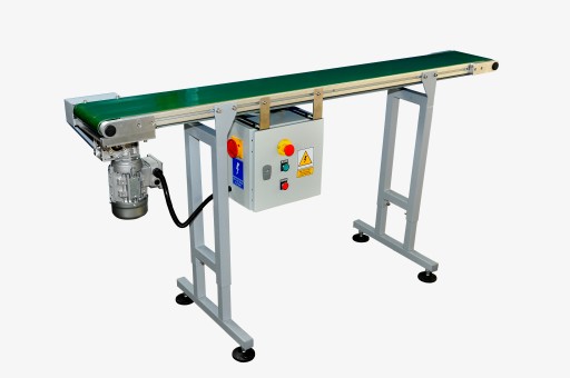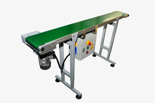 Samodzielny taśmociąg o nastawnej wysokości. Użyte materiały: stal nierdzewna i aluminium.. Sterowanie przyciskami START i STOP. Zasilanie jedno lub 3-fazowe.