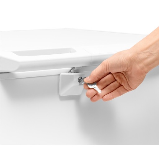 Uchwyt z zamkiem zabezpiecza zawartość zamrażarki.