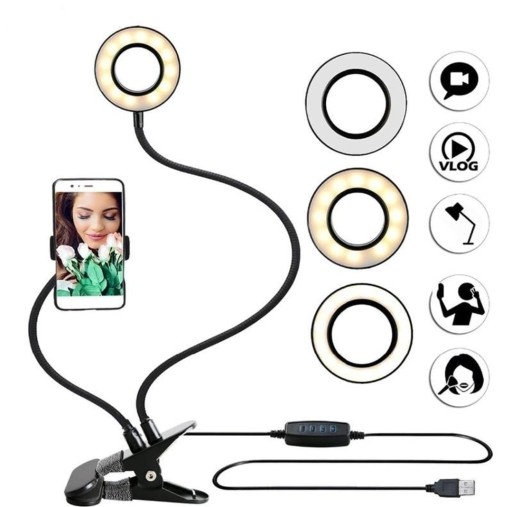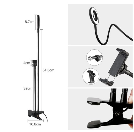 - Przedmiotem sprzedaży jest stojak z dwoma ramionami elastycznymi, uchwytem na telefon, metalowym klipsem oraz lampą LED.