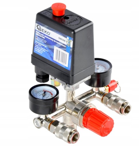 Wyłącznik ciśnieniowy z kolektorem, szybko złączkami i dwoma manometrami.