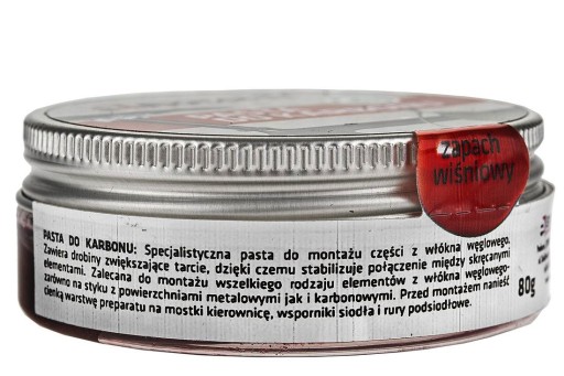 Zalecana do montażu wszelkiego rodzaju elementów z włókna węglowego- zarówno na styku z powierzchniami metalowymi jak i karbonowymi. Przed montażem nanieść cienką warstwę preparatu na mostki, kierownicę, wsporniki, siodła i rury pod siodłowe.