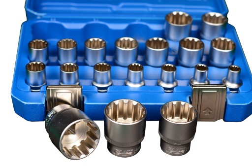 - Uniwersalny zestaw nasadek spline 12 kąt. Vario-Plus mający podwyższoną wytrzymałość i zapobiega obracaniu się śruby w nasadce co mogłoby doprowadzić do jej uszkodzenia.
