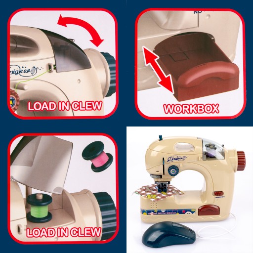W przedniej części zabawki umieszczona jest miarka, dzięki czemu dziecko będzie mogło w prosty sposób odmierzać kawałki materiału o odpowiedniej długości. W konstrukcji tej maszyny nie mogło zabraknąć pokrętła do szycia ręcznego, które umieszczone jest po prawej stronie zabawki, oraz rączki podnoszącej stopkę z igłą.